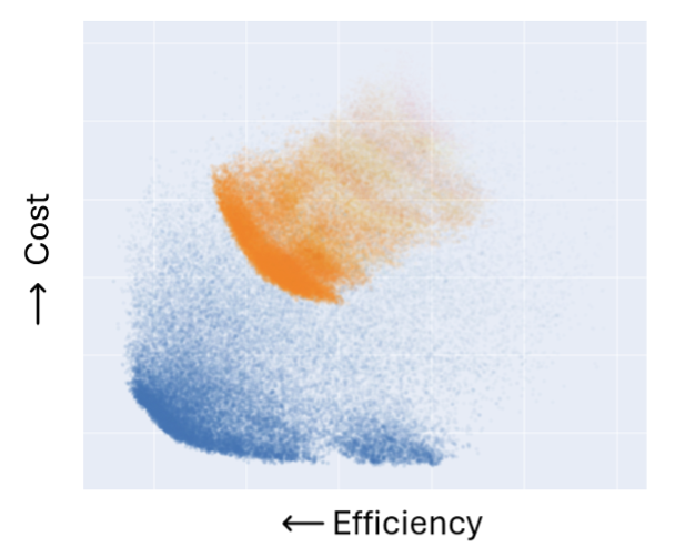 Figure 1. shows two multi-objective optimisation runs, where we want to reduce the total material (BOM) cost of the motor and at the same time increase its efficiency. The best designs (cost effective and efficient) are in the bottom left of the figure. Both runs have explored around 30k designs, but you can see that our new parametrisation (blue) covers much wider target space and ultimately converges to better designs – the blue pareto front is much further down-left than the orange one.